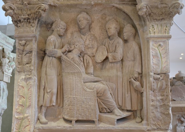 Relief of slaves adorning a woman. Rheinisches Landesmuseum, Trier, Germany. (2nd-3rd c. AD)