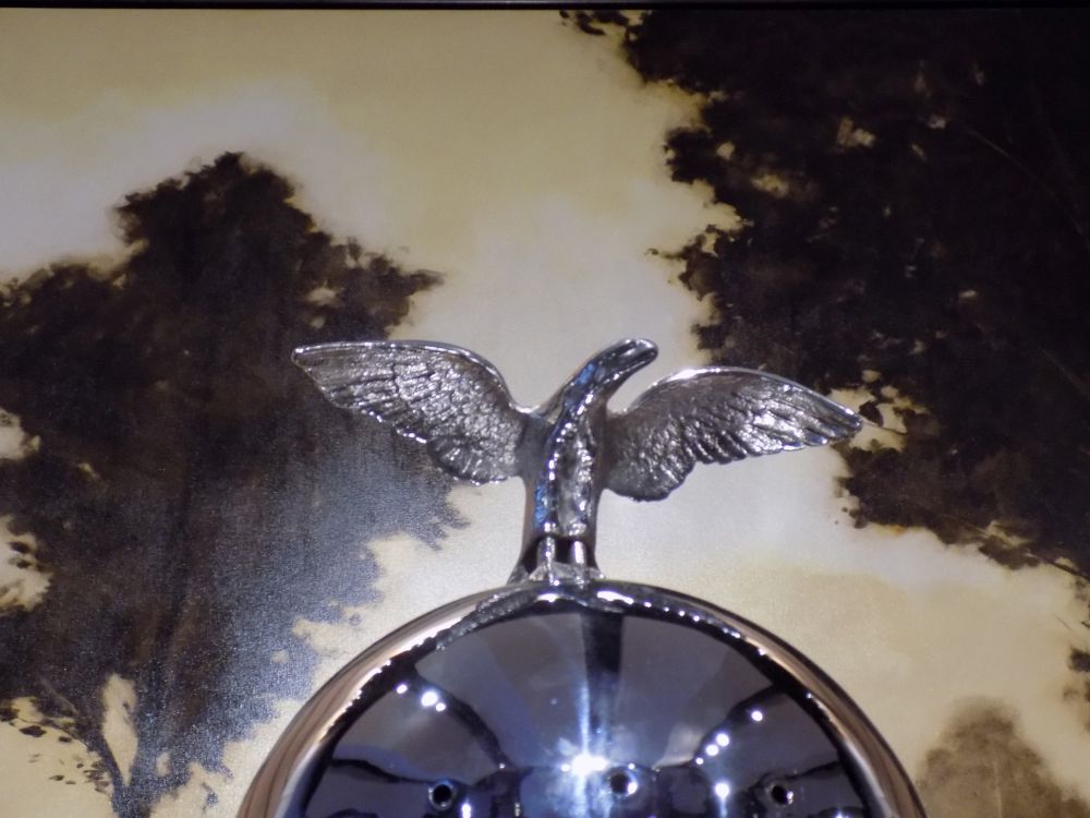 Close up of the top of the coffee urn, silver eagle, with a happily coincidental background of moody sky