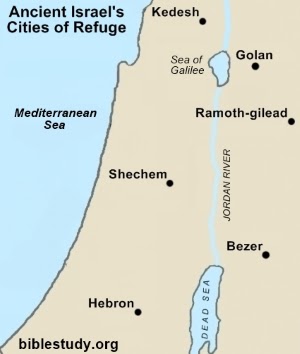 Cities of Refuge (source Smith’s Bible Dictionary) were six Levitical cities specially chosen for refuge to the involuntary homicide until released from banishment by the death of the high priest. (Numbers 35:6,13,15; Joshua 20:2,7,9) There were three on each side of Jordan.
