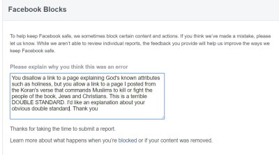 I used similar language as my original post that was blocked- “Theme this week”. I deliberately added “Fight those who do not believe in Allah” which is part of the Q’uran 9:29 verse. The language is inflammatory and threatens violence. According to Facebook’s Community Standards, threatening violence is against their Community Standards. Yet, my post linking to an Islamic page translating a violent threat from the Q’uran and language that is explicitly inflammatory was allowed to be uploaded immediately. Here is the screenshot of the published page.