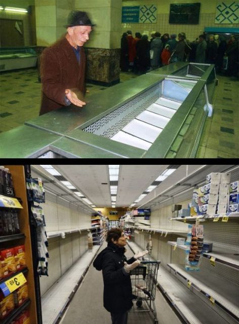 | Top, Soviet empty shelves, circa 1983; Bottom, 2020 empty shelves in LA amid COVID-19 |