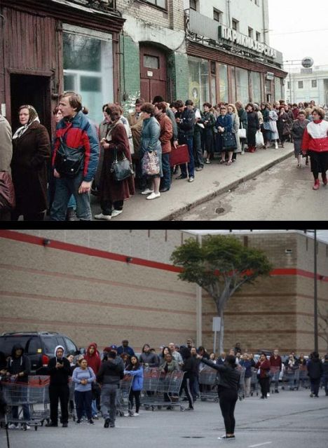 | Top, Soviet shopping line circa 1983; bottom, Hawthorne CA Costco Line waiting to enter |