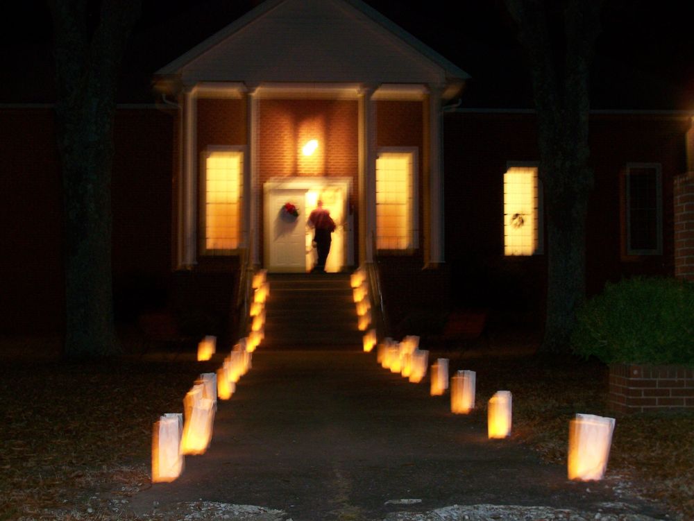 I also did not know what a luminary was. I think they are beautiful. They’re white paper bags filled at the bottom with sand and with a candle or tea light carefully placed in the sand, they are lit after dark and make a pretty glow.