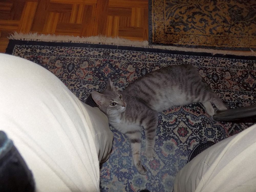 Then one day recently I emerged in the pre-dawn to go to work, and a kitten was on my stoop. He tried to get between my legs and go inside! Stray cats don’t act like that! Nor do feral cats. They’re skittish of people and stay away, hovering in interest at a distance, maybe, but certainly not attempting a home invasion!