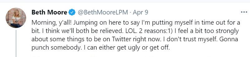 As for today, let us examine Moore’s publicly admitted behaviors that disqualify her from teaching or leading women. These are behaviors I’ve noted over the past ten years, and she consistently displays them. This is simply the latest example, not the only example. She tweeted in a three-tweet thread: