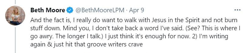 Finally, the last part of the Titus 2 verse, what does it mean to “dishonor” God’s word? The Greek here is blasphēmētai 987: “to slander, hence to speak lightly or profanely of sacred things.” Beth Moore fails the qualifications for an older woman teaching the younger because of this as well. Her tweet thread is an example. True repentance displays humility and a brokenness for how her poor behavior has reflected on Jesus. Moore doesn’t display any of that. It’s always about her.