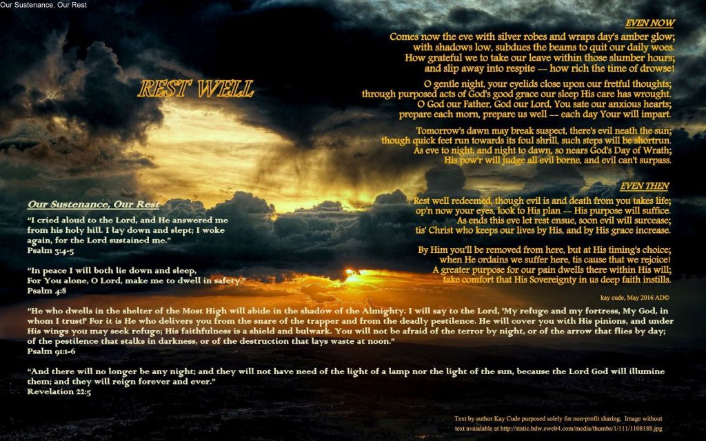 Posted in theology Kay Cude Poetry: “Rest Well” Posted on October 3, 2021 by elizabethprata Poetry by Kay Cude. Used with Permission. Open in new tab to view larger REST WELL Share this: Click to share on X (Opens in new window) X Click to share on Facebook (Opens in new window) Facebook Click to share on Pinterest (Opens in new window) Pinterest Click to share on Reddit (Opens in new window) Reddit Click to share on Tumblr (Opens in new window) Tumblr More Click to share on WhatsApp (Opens in new window) WhatsApp Click to share on Telegram (Opens in new window) Telegram Like Loading... Author: elizabethprata Christian writer and Georgia teacher's aide who loves Jesus, a quiet life, art, beauty, and children. View All Posts