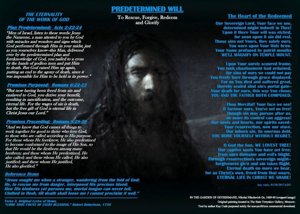 Posted in poetry, Uncategorized Kay Cude: Predetermined Will Posted on November 21, 2021 by elizabethprata Kay Cude poetry. Used with permission. Right-Click to see larger in new tab PREDETERMINED WILL Share this: Click to share on X (Opens in new window) X Click to share on Facebook (Opens in new window) Facebook Click to share on Pinterest (Opens in new window) Pinterest Click to share on Reddit (Opens in new window) Reddit Click to share on Tumblr (Opens in new window) Tumblr More Click to share on WhatsApp (Opens in new window) WhatsApp Click to share on Telegram (Opens in new window) Telegram Like Loading... Author: elizabethprata Christian writer and Georgia teacher's aide who loves Jesus, a quiet life, art, beauty, and children. View All Posts