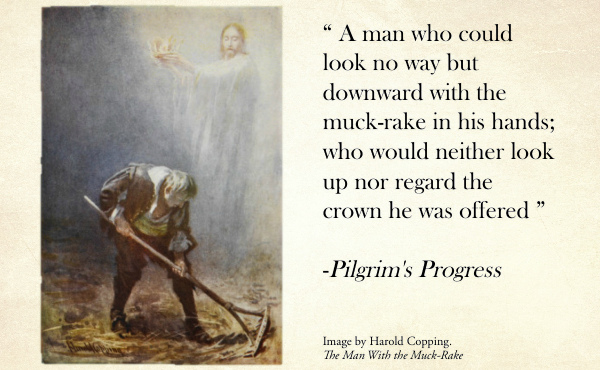 This done, and after these things had been somewhat digested by Christiana and her company, the Interpreter takes them apart again, and has them first into a room where was a man that could look no way but downwards, with a muck-rake in his hand. There stood also one over His head with a celestial crown in His hand, and proffered him that crown for his muck-rake; but the man did neither look up, nor regard, but raked to himself the straws, the small sticks, and dust of the floor. ~The Pilgrim’s Progress, Part 2