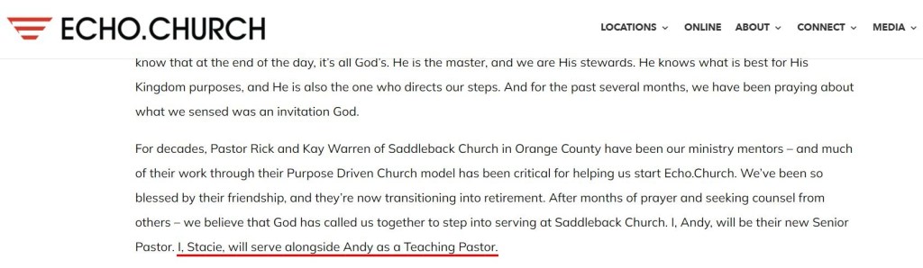 I bring all this up because it is not just old history. It is part of an apostatizing trajectory. After 42 years, Warren prepares to step down as senior pastor of Saddleback Church. He announced his replacement. Or rather, his replacementS, plural. He and his search team settled on a couple to replace him. They are Andy & Stacie Wood, leaving their tenure as Lead Pastor and Teaching pastor, respectively, at Echo Church in San Jose CA. They will transition to Saddleback over the next few months. It is no surprise that since last year when the open secret became more widely known, that Warren was not only for women pastors but was ordaining them, that the next lead pastor would come as a two-for-one bundle.