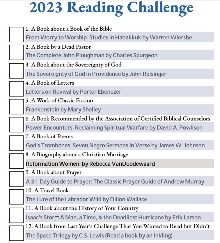 Another value of the Reading Challenge is that I tend to track my progress at GoodReads. I know in addition to the 24 books listed I read a few other booklets from Chapel Library, but now I do not remember which ones. At least I have these I’d tracked thanks to GoodReads.