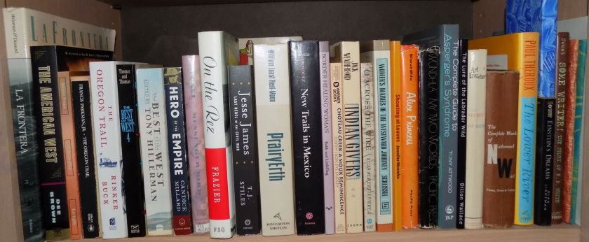 One thrift store I haunt has a wall of books. I take a chair and sit down in front of each section so I can see the bottom shelves and so I won’t get impatient as my arthritic knee kicks up. I’m not in anyone’s way and if I am I just move aside for a while and let others browse.