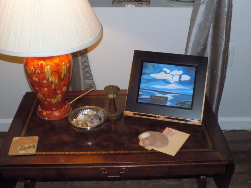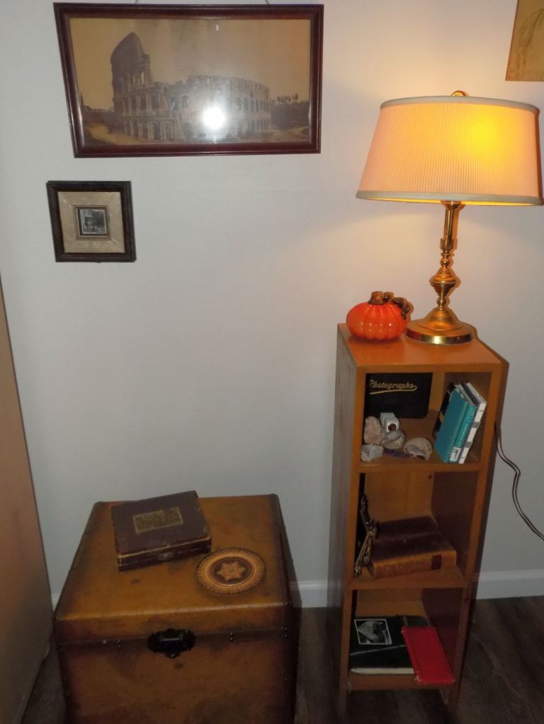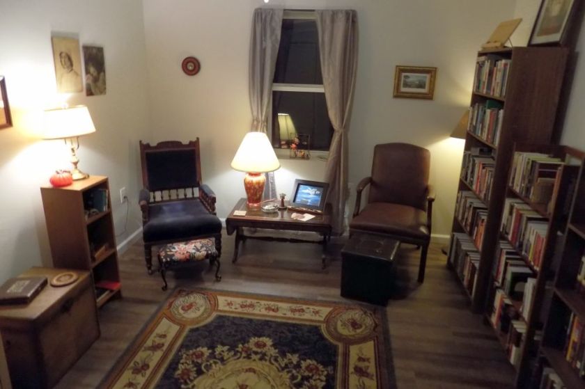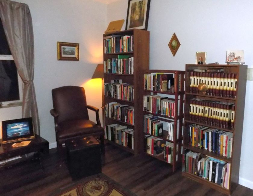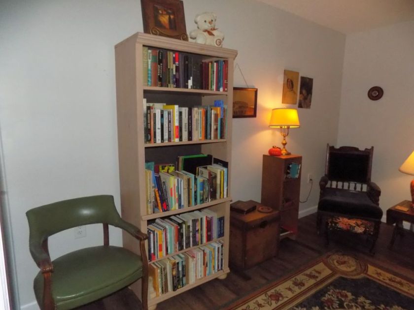My library room. I usually sit in the chair on the right and turn on the lamp just over my shoulder.