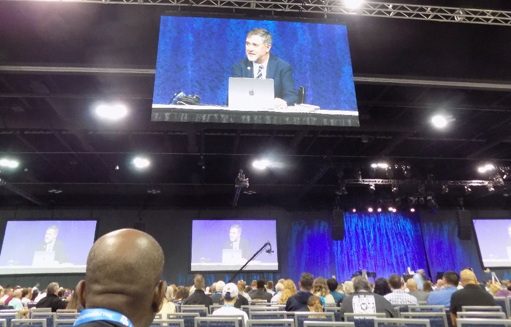 The Movie The Essential Church was going to be shown at 7:30pm, but just as the moderator was about to come on stage, a bomb threat was called in. Thousands were evacuated from the Georgia International Conference Center, and rather than despair, many of them went next door to the nearby hotel lobby and they began singing the hymn Great is Thy Faithfulness.