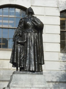 Left, the statue of Hutchinson on the Massachusetts State House at 24 Beacon Street, Boston, MA. Still so controversial 375 years after death, and almost 100 years after the statue was commissioned, the original recipient, the Public Library, refused it and the Legislature ignored it for 2 years. It was finally installed in 2005. Story here: A heretic’s overdue honor