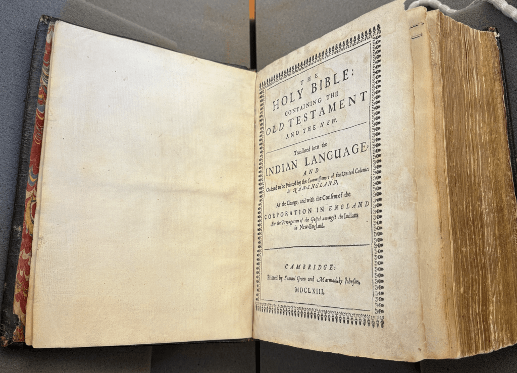 Eliot then ramped up his commitment to translate the Bible into their language, Algonquin. No easy task, there was no Algonquian alphabet! Eliot had to devise one, and thus became a lexicographer and grammarian in their language. He spent the next 14 years doing this but eventually in 1663, published “Mamusse Wunneetupanatamwe Up-Biblum God”.