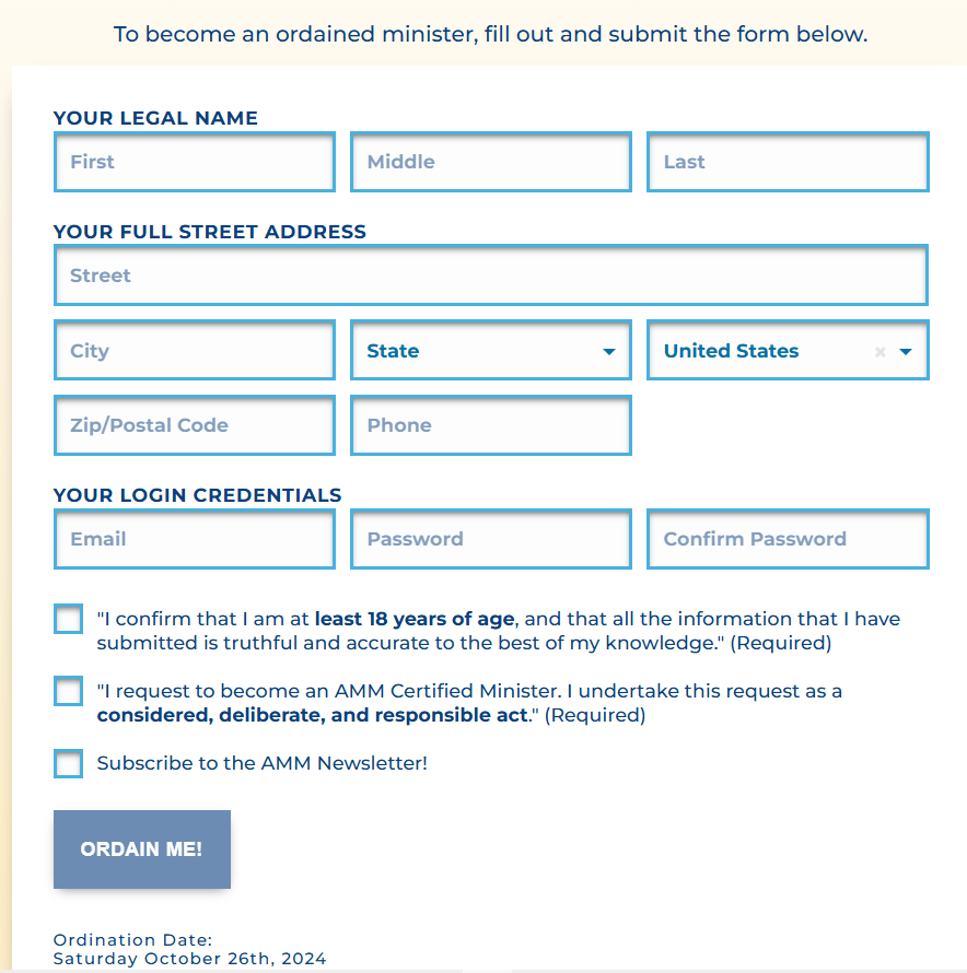 AMA’s requirements to become an ordained minister are to fill out this form. That’s it.