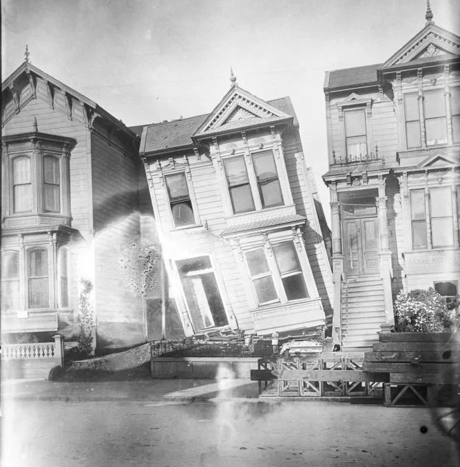 The shaking from the earthquake liquified the ground under parts of San Francisco. Many houses, like this one in Butchertown, sank into the mud. Photo: BSL Archive