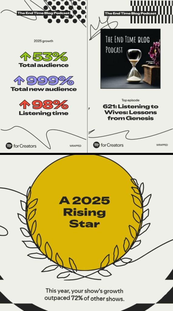 In my “Spotify end of year round up” I learned that the most listened to podcast essay was the one titled: Listening to Wives: Lessons from Genesis. It was played 215 times more than any other episode. I wonder what caught the people’s attention? If you prefer reading to listening, the essay is here to read.