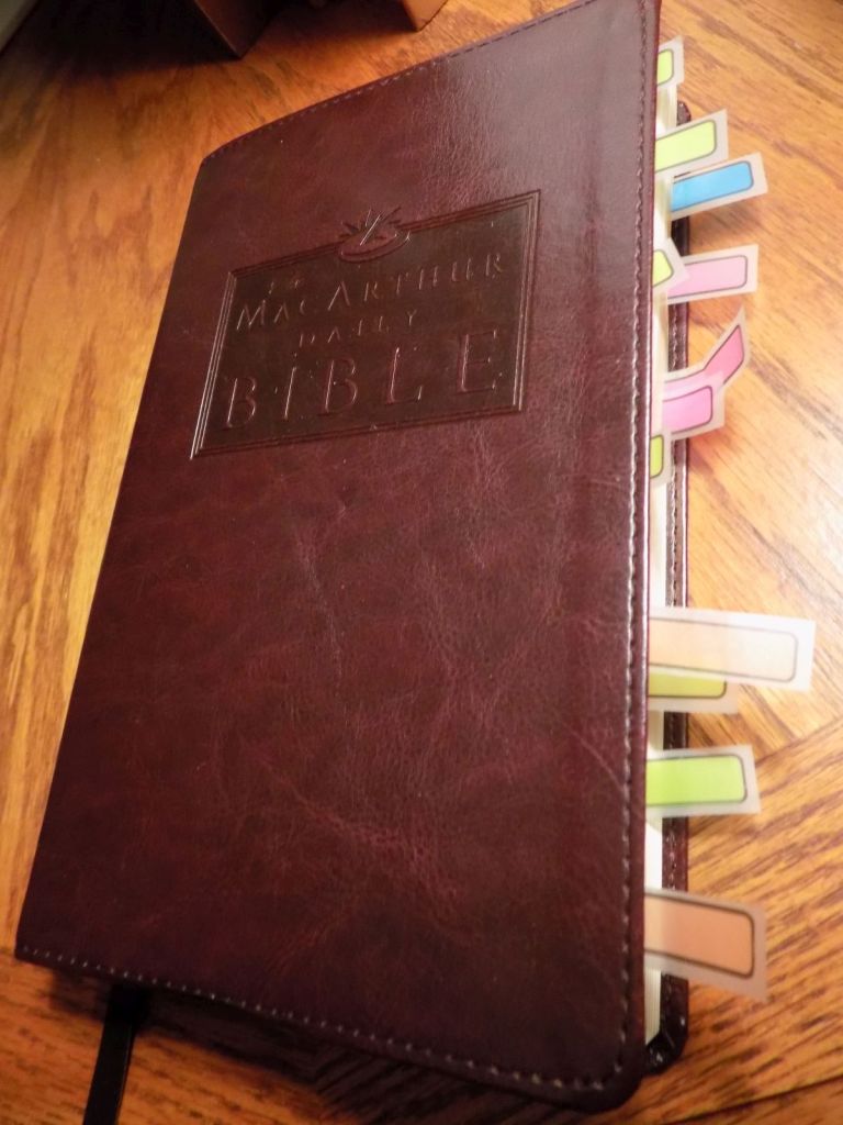 This year for my Bible reading plan, I used the John MacArthur Daily Bible: Read the Bible in One Year, with Notes from John MacArthur, NASB. I loved it and I’ll use it again. I liked the leather binding, the easy to read pages, and of course the content is wonderful. I never write in my Bibles, I use arrow post-its. You can see all the interesting things I’d tabbed for follow up!