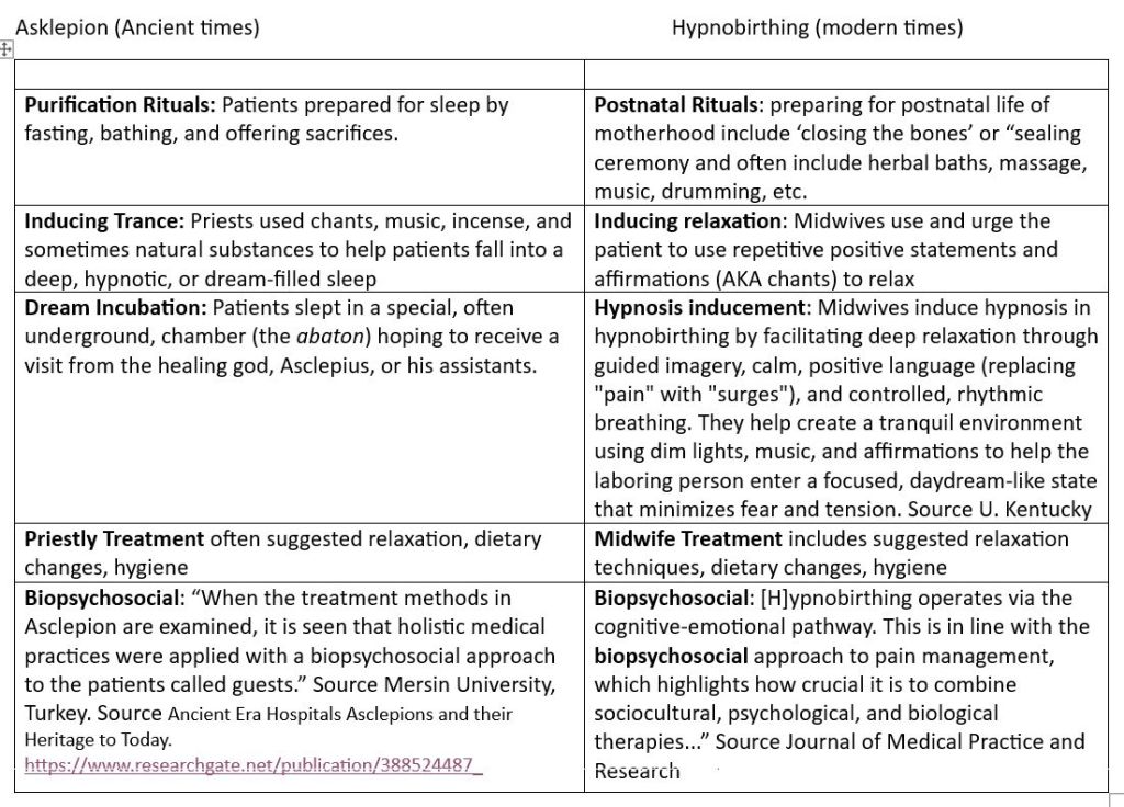 As I read about hypnobirth and the ancient Asclepion, I noticed similarities in the approaches to wellness, the rituals, and the care of the patients.