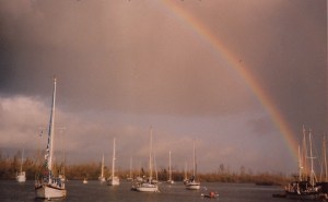 We got settled, anchoring the boat and buttoning up the sails etc. We were thinking about what to make for dinner when we heard a ‘whoosh’ and turned to look at the river entrance. It was a tall ship! The HMS Rose (right) was making a slicing sound in the river and the whoosh was the wind in their sails. Our boat was the only boat in the river and immediately the Rose aimed for us. They lowered the US flag and put up the Jolly Roger, lol, a bunch of sailors being trained were now having a bit of marine fun. They circled around us under full, billowing sail. It was thrilling to see a tall ship this close, just 50 feet away. As they tacked around us and sailed a bit further away, they let off the cannon! A boom and a puff of smoke and cheers from the sailors broke the stillness of the quiet waters and woke the sleeping geese along the shore.