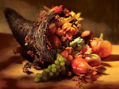 At Thanksgiving we often see the American symbol of the ‘horn of plenty’ also known as the Cornucopia. The horn is filled to overflowing with harvest items from this time of year, such as this depiction from American Greetings freebies: