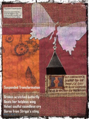 In this piece below I felt intuitively that my spirit was trying to transform but something was holding me down while at the same time something was pulling me up. In the piece below, the butterfly is broken and unable to transform because it is caught in a net as it attempts to fight off whatever has captured it. The poem, which I re-typed in larger font, mentions Strigoi. This is a folk personage who, in Romanian legend, is a kind of vampire. I intuitively felt that a dark force of evil had caught me, so I used the reference to Strigoi.