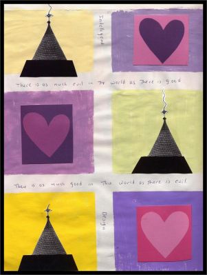 You might notice that same cupola in Intelligent Design that is in the Suspended Transformation piece. It has a sort of evil eye as a wind vane and to me, seemed very demonic. It represented a strong tower or fortress of evil. My mistake then was thinking that good, or love, and evil were equal combatants in this world. Of course I know now that Jesus has overcome everything and evil bows to His will. The battle is not equal. It is not even.
