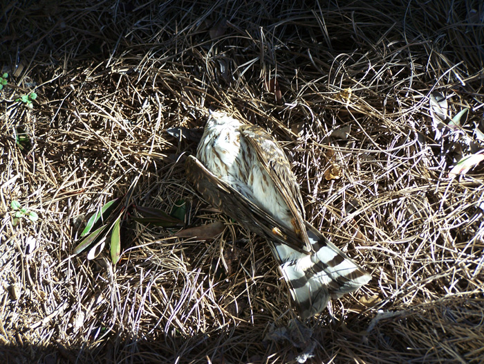 Now most likely this juvenile hawk simply flew into the glass breezeway and fell down dead. But in thinking of the events far away, they were brought home to me in vivid detail. If I was moved, then freaked, by one dead bird, how must have the people of Beebe Arkansas felt when upwards of 8000 fell on them?? How must the residents of Faenza have felt when thousands of dead doves fall stiffly to the ground? It IS freaky, moving, disconcerting, and upsetting to see dead animals, especially vulnerable ones like baby hawks or doves.