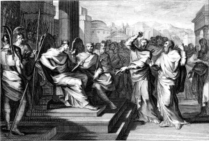 “and the Lord said, ‘Who will entice Ahab, that he may go up and fall at Ramoth-gilead?’ And one said one thing, and another said another. Then a spirit came forward and stood before the Lord, saying, ‘I will entice him.’ And the Lord said to him, ‘By what means?’ And he said, ‘I will go out, and will be a lying spirit in the mouth of all his prophets.’ And he said, ‘You are to entice him, and you shall succeed; go out and do so.’ Now therefore behold, the Lord has put a lying spirit in the mouth of all these your prophets; the Lord has declared disaster for you.” (1 Kings 22:20-23). Illustration, The Prophet Micaiah Before the Kings, 17th-c. woodcut by Otto Elliger.