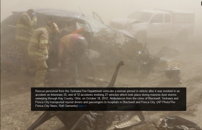 “A massive dust storm swirling reddish-brown clouds over northern Oklahoma triggered a multi-vehicle accident along a major interstate Thursday, forcing police to shut down part of the heavily traveled roadway amid near blackout conditions. In a scene reminiscent of the Dust Bowl days, choking dust suspended on strong wind gusts shrouded Interstate 35, which links Dallas and Oklahoma City to Kansas City, Mo. Video from television station helicopters showed the four-lane highway virtually disappearing into billowing dust on the harsh landscape near Blackwell, plus dozens of vehicles scattered in the median and on the shoulders. “I’ve never seen anything like this,” said Jodi Palmer, a dispatcher with the Kay County Sheriff’s Office.”