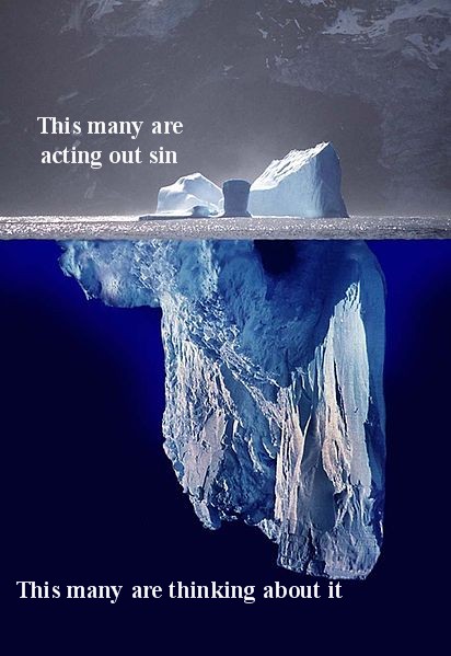 If we are seeing these sinful acts happen more and more frequently, imagine how much more people are thinking about them, first. The acting out is the last stage of the progression. The visible heinous act is only the tip of the iceberg to the heinous acts that occur in the mind. Floating icebergs have a significant proportion of their mass below the surface of the water. When we say “This problem is just the tip of the iceberg,” what we are really saying is “A small evident part or aspect of something largely hidden.” If the evident part is getting bigger every day, how much larger of a problem is the hidden part? (Definition and unmodified photo from Wiki).