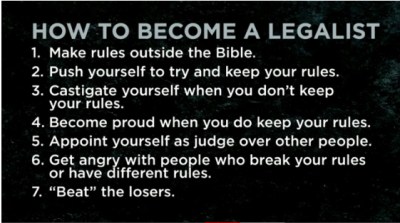 And CARM.org defines Legalism: “In Christianity, legalism is the excessive and improper use of the law (10 commandments, holiness laws, etc). This legalism can take different forms. The first is where a person attempts to keep the Law in order to attain salvation. The second is where a person keeps the law in order to maintain his salvation. The third is when a Christian judges other Christians for not keeping certain codes of conduct that he thinks need to be observed.”