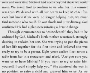 I searched for clarity in the book and got none. On one page Moore said Michael was “orphaned”, on the next she said that his birth parents “gave up on each other and on him”, and that the “marriage of his second guardians collapsed”. After 7 years, Moore says the mother (Anne) “resurfaced,” even though she was “a close family member“, “strongly desiring” her son back. However, there was no mention of any legal proceeding nor any custody battle, even though she consistently said in the book that they had adopted him. Chapter 3 is called “The Adoption.” On page 54 Moore said she sat in a restaurant with Anne and after assurances that this was what Anne wanted, Moore said that Anne “granted him to us.”