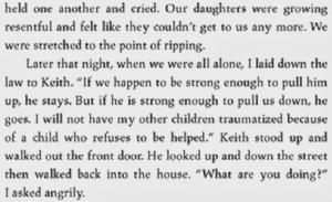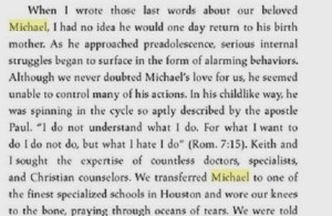 Very early on Moore says the family saw the emergence of Michael’s angry behavior. She said she “envisioned the adoption to be a glorious romance” but was instead the family became increasingly traumatized by his “fits of violence and anger”. There were many school disciplinary hearings, and many nights Moore and her husband were at a loss on how to deal with him. In his 4 short years prior to being adopted by the Moores, she wrote he was continuously abandoned, abused, neglected, and had Child Protective Services intervening on a rotating basis. When Michael entered the Moore home at age 4, it wasn’t long before they knew they had a long haul on their hands. Fear of abandonment again raised its head while during the day he refused to cry, laugh, or love. Yet at night he insisted on falling asleep by holding Moore’s head and chanting “Mommy please don’t leave me.” Finally Moore said they were “stretched to the point of ripping”.