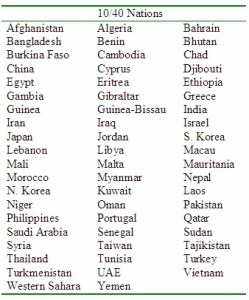 “The 10/40 Window is a term coined by Christian missionary strategist Luis Bush in 1990 to refer those regions of the eastern hemisphere, plus the European and African part of the western hemisphere, located between 10 and 40 degrees north of the equator, a general area that in 1990 was purported to have the highest level of socioeconomic challenges and least access to the Christian message and Christian resources on the planet.” Wikipedia list of 10/40 nations is below.