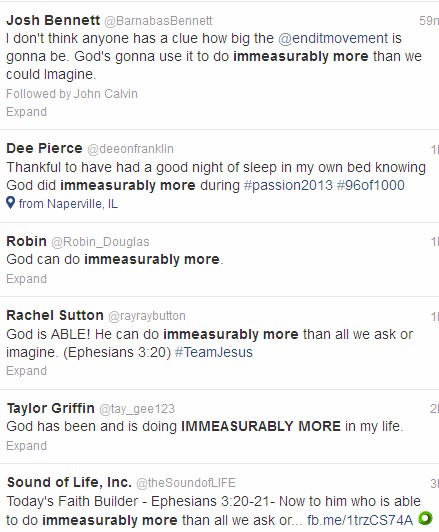 Overall, I took away that what was taught to the young adults at Passion 2013 was that visions are normal and to be expected. If you’re not having visions and hearing God’s voice speaking to you personally, something is wrong with you. Topically addressing the scripture in a skeleton context while filling the rest of the time with personal anecdotes and description of ecstatic experience is a sermon. What we experience in ecstatic mode is to be preferred to diligent study of the word. In other words, the bible is OK, but visions are better. The world’s social ills can be fixed with zeal and money. Plus, fixing the world’s social ills with zeal and money should be the purpose of my life. A real faith includes volume, excitement, drama, and surfing from one high encounter with God to the next.