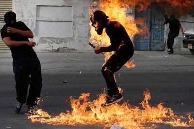 Above, a Bahraini anti-government protester is engulfed in flames when a shot fired by riot police hit the bomb in his hand that he was preparing to throw during clashes in Sanabis, Bahrain. Hasan Jamali/AP. It has been two years since Arab Spring and Saudi-led forces quelled unrest in Gulf island. Protests mark the date