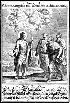 | Jesus and Nathanael WEIGEL, Johann Christoph 1695, Woodcut. Source |