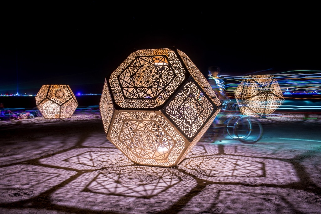 Inspired by art, physics, math, light, and technology, the incredible art installations of HYBYCOZO have been an absolute sensation since they first went viral after the 2016 Burning Man Festival. By laser cutting intricate patterns into large polyhedrons, artists Yelena Filipchuk and Serge Beaulieu have created a striking visual identity through their collaboration. Over the past several years, their work has appeared across the globe—in civic installations in Singapore and Dubai to exhibitions at the Smithsonian’s Renwick Gallery.