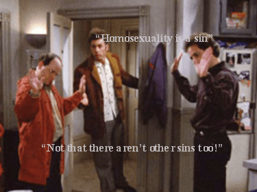 In the crucible of what passes for discussion about the sin of homosexuality, I’ve noticed an insidious acceptance in Christians of one of the conditions that the gay lobby insists we make. This acceptance has crept in and is in fact a double standard. It is akin to the scenes in the old Seinfeld episode “The Outing.” Let me explain.
