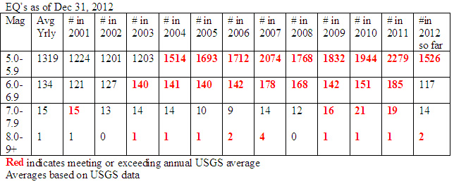 [Ed Note: the article to which Austin refers that states big earthquakes are not quantifiably increasing was written in 1999. I think from the data above that I’ve gathered into a chart, we can see by now from the perspective of 14 years later that the cycle of big earthquakes is on the upswing]