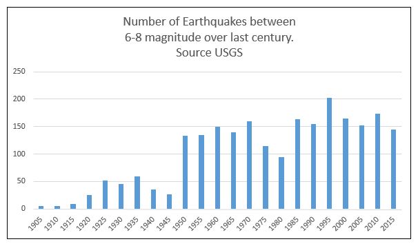 Let’s look at a long-term trend of global quakes. I update this table every year. Click to enlarge.