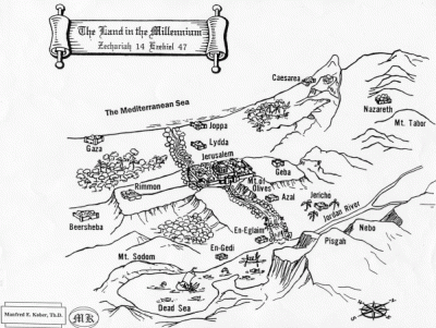 Manfred Kober has provided the following illustration of the future topography of the Holy Land showing this amazing river of life flowing into the two great seas: