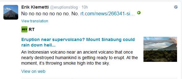 Erik Klemetti is a Professor of Geology who specializes in volcanology. He also has taken on the journalism world for the frequent false, misleading, or hyperbolic reporting on science topics. I feel his pain. As a former journalist I know for a fact that we stumble on science and fail almost always on math/economics reporting. Here Dr Klemetti is frustrated with a Russia Today news piece on the newly active volcano Sinabung in Northern Sumatra.