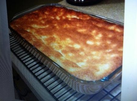 This recipe uses a box angel food cake and a 20 ounce can crushed pineapple, in its own juice. That’s it. Don’t even grease the pan, the cake won’t rise. I stir the the ingredients together by hand and let sit for 2-3 minutes. It froths up. Then pour into a baking dish. I use a 13-inch glass dish. Bake for the allotted time and that is it! Top with Cook Whip if desired, or fresh fruit.