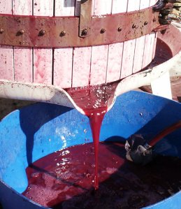 In old days the Israelites’ wine production was a major industry. Ancient wine presses have been discovered all over the Middle East, and in and around modern day Israel. The grapes would be gathered, and placed in a rectangular pit entered from a cleaned mosaic floor. The floor of the press would be stone, also washed. The trite picture of people stomping on grapes is not so trite: the gentleness of the underside of the foot would crush the grapes enough to release the juice but not crush the bitter seeds, releasing tannins into the wine. The juice would be allowed to run down a slough, through a filter made of leaves and thorn ranches. Seeds and twigs removed, the second pressing would then involve a press of stone, like the one below. Notice the trough running around the rim of the stone, to catch the juice.