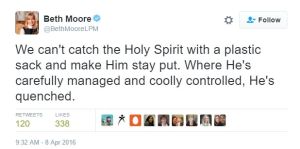 Do you ladies see the internal inconsistency in this? You “can’t catch the Spirit & make stay Him put” but you CAN catch Him & control Him. On the surface, false teachers’ doctrine always sounds Christian-y, but upon digging only slightly deeper, it falls apart. That’s because it’s cotton candy, all clouds and no water. (Jude 1:12).