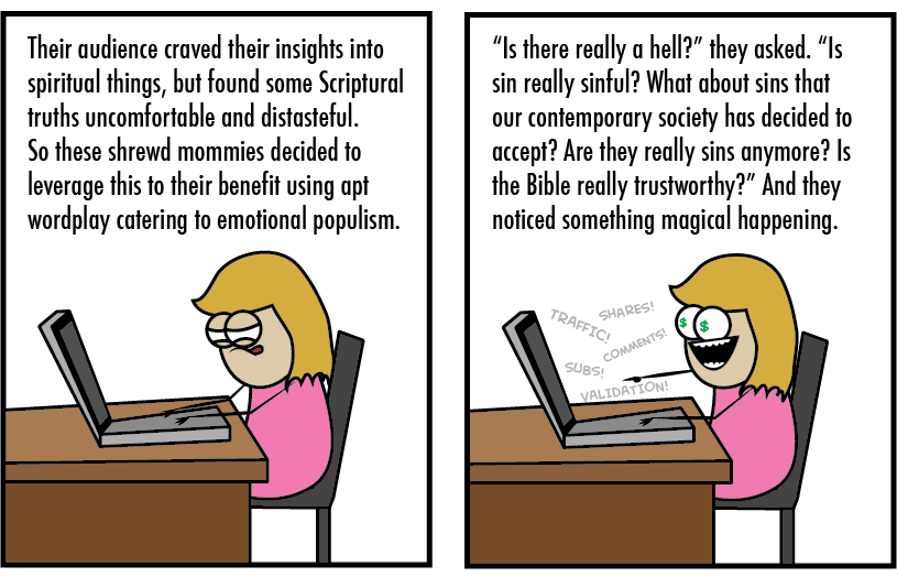 In this second part I’m looking at where the modern woman is doing her dark work against Jesus: it’s not just inside the church anymore. Mommy bloggers and online amateur theologians have grown to be an enormous network outside the church and thus often operate outside their husband’s watchful eye and usually outside their pastor’s eye. Much mischief happens on mommy blogs and amateur online theologian platforms and satan uses these to filter back to the church, to our detriment. I myself am in the amateur online theologian category so definitely don’t take what I write at face value but test it.